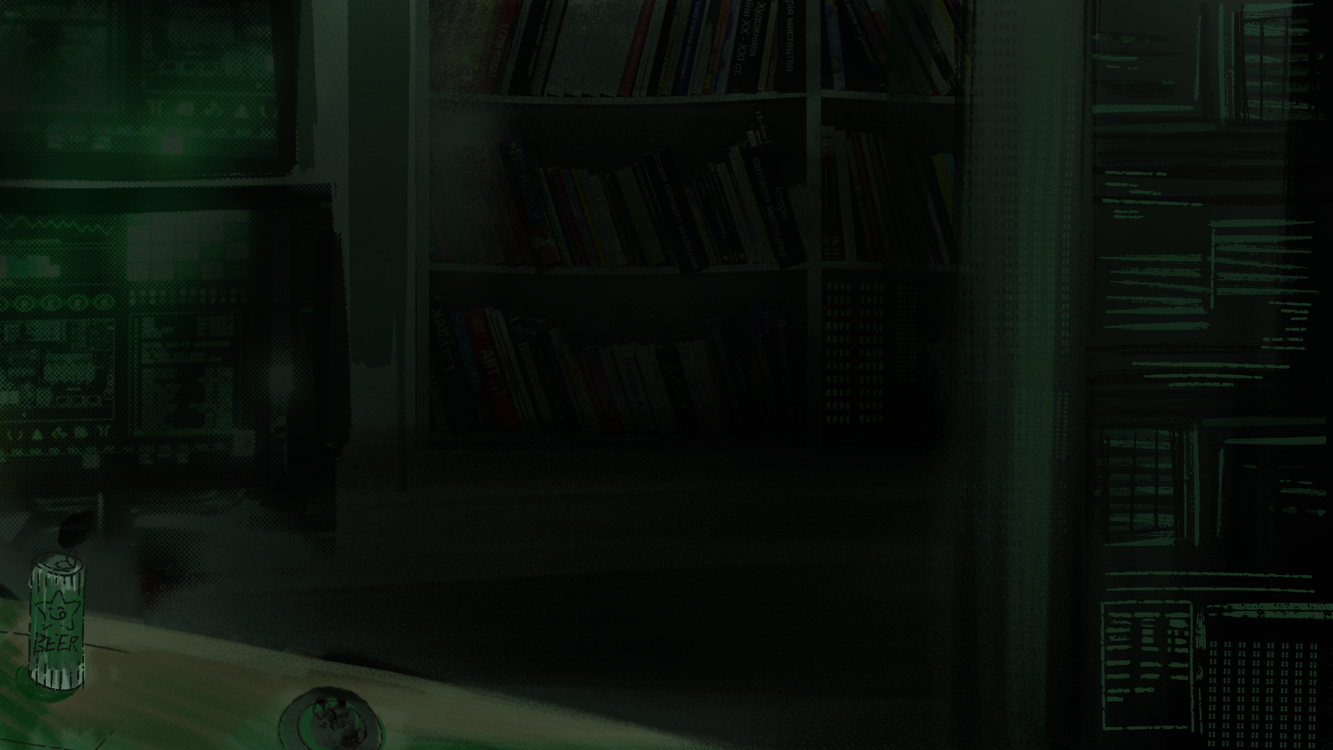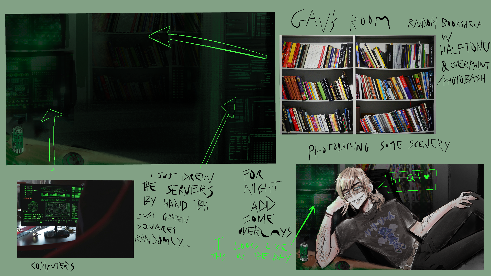 maybe a "behind the scenes" of how i made his room would be interesting? i'm no skilled BG artist, but i wanted to try photobashing/overpainting this time. i had to paint over the pictures and cut them up so that they wouldn't look too "real", but i think doing this and adding some halftones and textures as well as scratch-drawn servers and walls, desks etc made it feel more cohesive.
