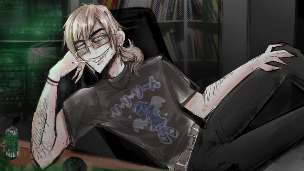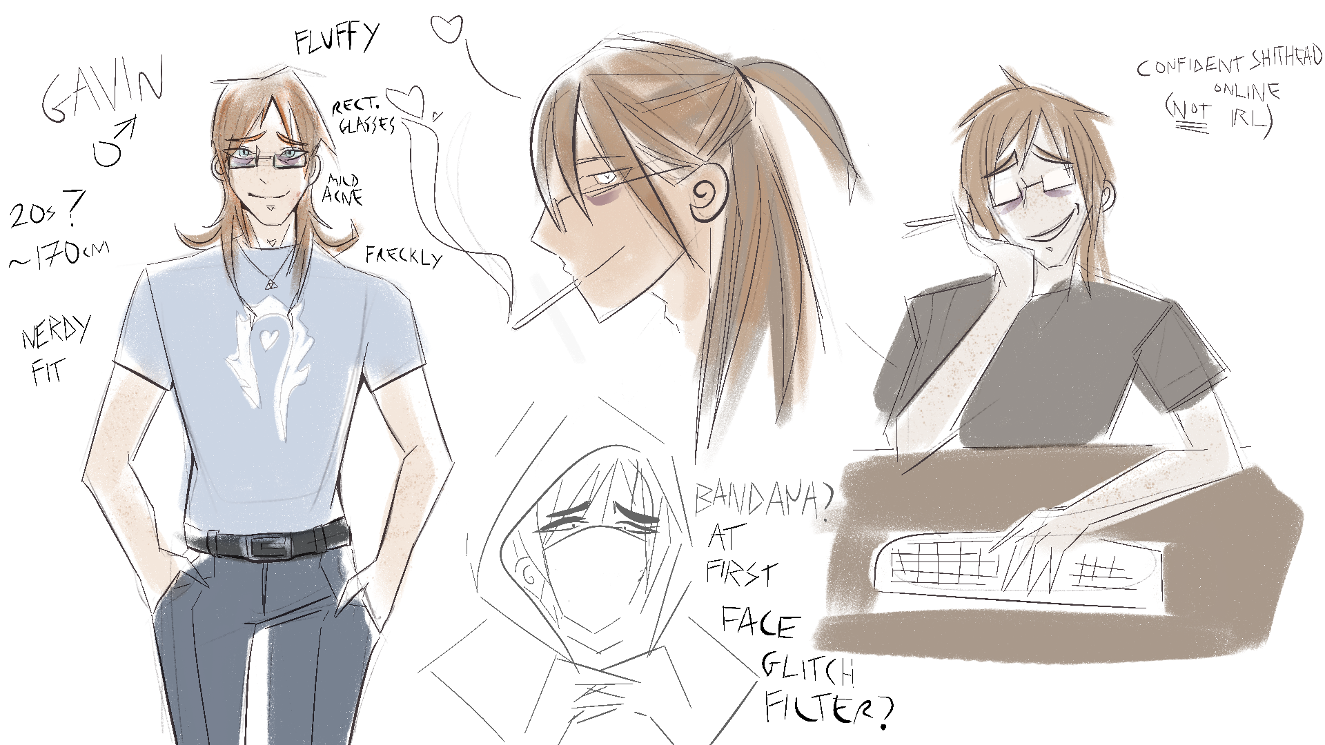 here's some of the original concept art i had made for gav. i really wanted to give him a charmingly nerdy vibe, but ideally give him a little edge as well with some jewellery and long hair. i hope that you enjoy his (hopefully?) cute and endearing awkwardness. of course, it wouldn't be right for me to have a leading man without including my favourite qualities of "terrible eyesight" and "terrible smoking habit". this time at least the "terrible person" part of the trifecta doesn't seem like it applies...?